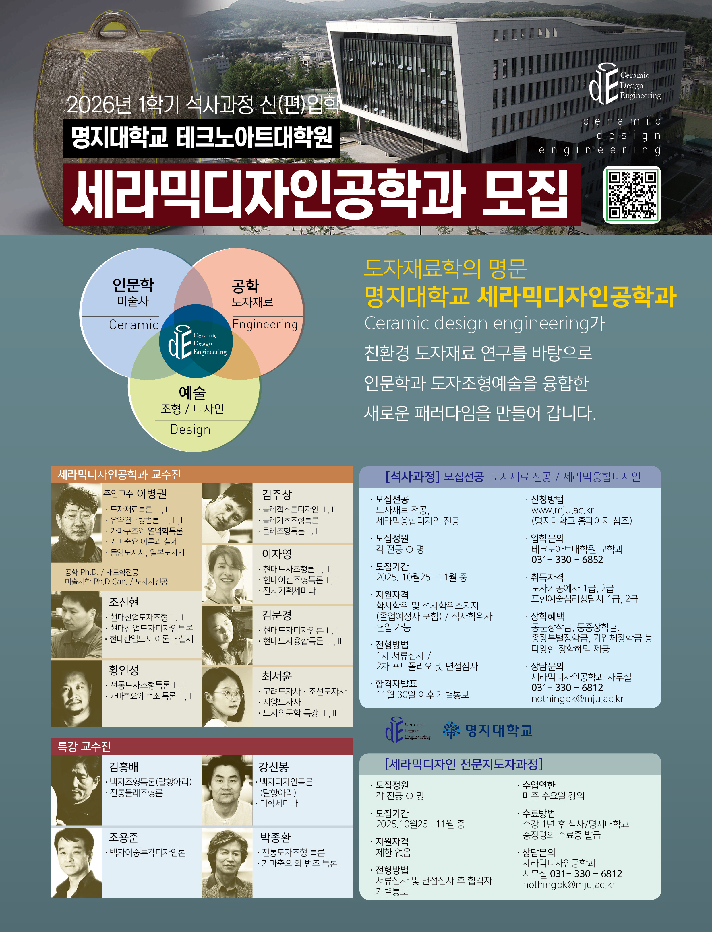 예술과 공학이 융합되어 새로운 미래산업을 창조해나가는 명지대학교 산업대학원 세라믹아트공학과는 현시대가 원하는 아트산업화에 기여하는 인재를 양성한다.